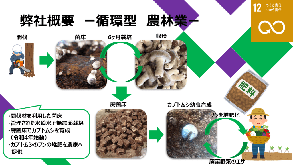 菌床栽培のしいたけは発生と収穫を数回繰り返します。数回の収穫を終えた菌床は産業廃棄物として処分する必要があります。廃棄物を処理する際には、二酸化炭素を排出し、エネルギーも必要とします。世界規模で脱炭素の動きがある中で、何かできないかと考えました。